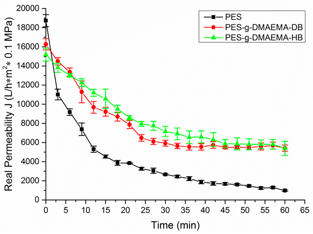 After the bacteria solution filtration and external cleaning, the pure water fluxes of the PES membranes were measured again. The relative flux recovery (RFR), calculated by the ratio of final pure water flux to the initial one, revealed the efficiency of cleaning bacteria. The higher RFR value means the stronger anti-adhesion ability. It was shown in Table 3 that the RFR value of PES membrane was only 55.1%, while higher values were obtained by PES-g-DMAEMA-DB and PES-g-DMAEMA-HB (88.3% and 92.7%, respectively). This suggested that bacteria attached on the membrane surface was effectively killed by DMAEMA-DB and DMAEMA-HB or lost the adhesion ability. Therefore, the modified membranes could be used for a longer time. These results were supported by the SEM images of the adhesion experiment as well.