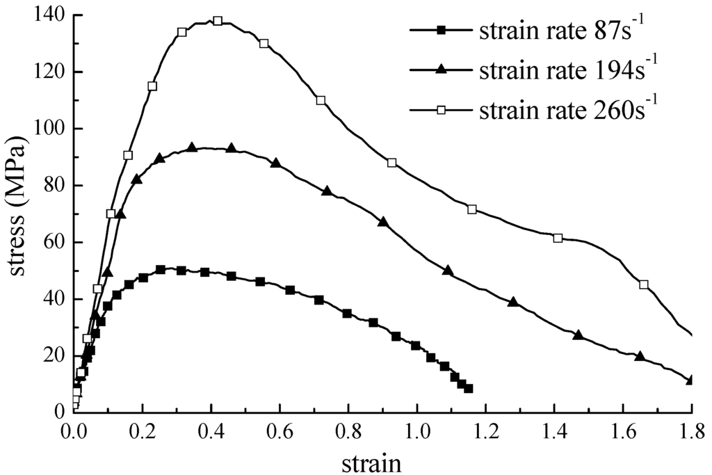 This study verified the analytic solution derived in the previous section by conducting an SHPB test with concrete samples composed of fine aggregates. The height and diameter of the sample were 25 mm and 50 mm, respectively. The density of the sample was 2080 kg·m−3, and the maximum grain size was 2.5 mm. Figure 2 presents the SHPB apparatus. Based on the SHPB test of viscoelastic-plastic materials, the effects of the viscous coefficient, the elastic modulus, density, and the frequency of the stress wave on the attenuation factor were investigated. The stress-strain curves for the concrete specimen for three strain rates are presented in Figure 3.