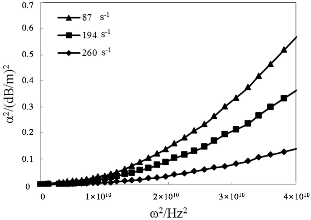 The relationship between the attenuation factor and the frequency of the stress wave can be explored using the parameters in the constitutive equation of viscoelastic-plastic rock-like materials obtained from the experimental test using the SHPB apparatus. The viscoelasticity formula Equation (20a) and the viscoelasticity plasticity formula Equation (23a) can be used for analysis. As shown in Figure 6 and Figure 7, the square of the attenuation factor is closely correlated with the frequency of the stress wave. An increase in the frequency of the stress wave increases the attenuation factor, regardless of the strain rate.