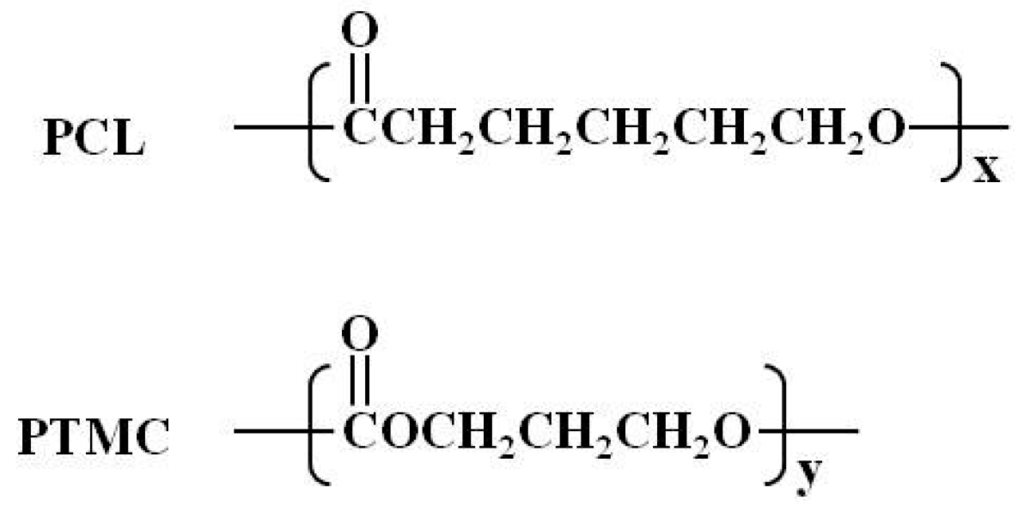 Alternatively, polymer materials are best when good flexibility and high tensile strength are desired properties. The treatment of an esophageal stricture, esophageal fistula, and postoperative anastomotic fistula is prevalent in literature [11,12,13,14,15]. Combining the two previously mentioned types of treatments, currently existing stents consist of a polymer membrane coating on a metal stent. This method maintains the mechanical performance while improving the implantation and removal process. Two polymers commonly used are Poly(ε-caprolactone) (PCL) and poly(trimethylene carbonate) (PTMC) (Figure 1). These aliphatic polyesters are biodegradable and biocompatible. They degrade at different rates and are used in different biomedical applications. With uses in creating scaffolds for tissue engineering, PCL is a non-immunogenic semi-crystalline polymer with slow biodegradability and good drug permeability [16]. On the other hand, PTMC is an amorphous biopolymer with good mechanical resistance and high thermal and chemical stability. It is elastic at ambient temperature. PTMC was shown to not have any influence on heart, liver, and kidney tissues through in vivo biocompatibility and toxicity assays [17]. Furthermore, combining these two polymers into the PCL-PTMC mixed polymer has shown potential for surgery and nerve guide repairs. It is highly biocompatible and has controllable mechanical properties and degradation rates [18,19]. The use of this mixing polymer as a coating membrane has not yet been reported.