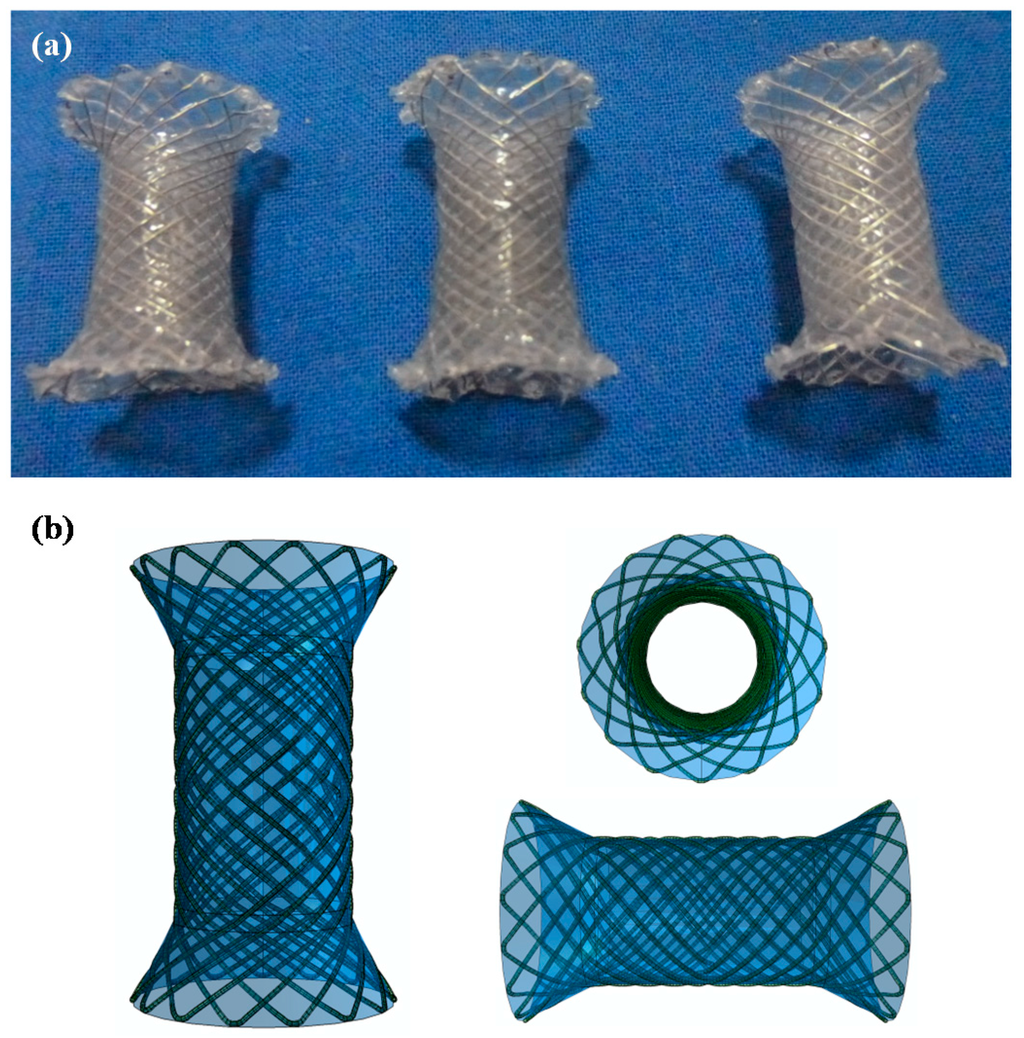 (a) Photographs of the perfecting opened PCL-PTMC coated magnesium-stent shape; (b) the covered membrane stent’s different profile diagrammatic cross-section.