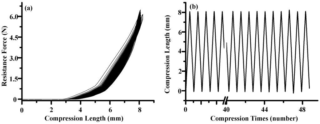 (a) Mechanical compression curve analysis of the stent; (b) compression-recovery curves of length and time in repeated compression tests. (n = 5, constant pressure = 10 N).