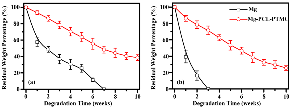 Analysis of the degradation of the bare magnesium and magnesium-(PCL-PTMC) stent samples in phosphate-buffered saline with pH values of 7.4 (a) and 4.0 (b).