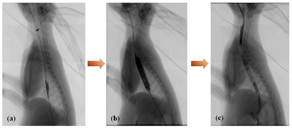Esophagography during stent insertion (a); balloon dilation after magnesium-(PCL-PTMC) stent insertion (b) and immediate esophagogram (c) reveals that the stented esophagus is well patent.