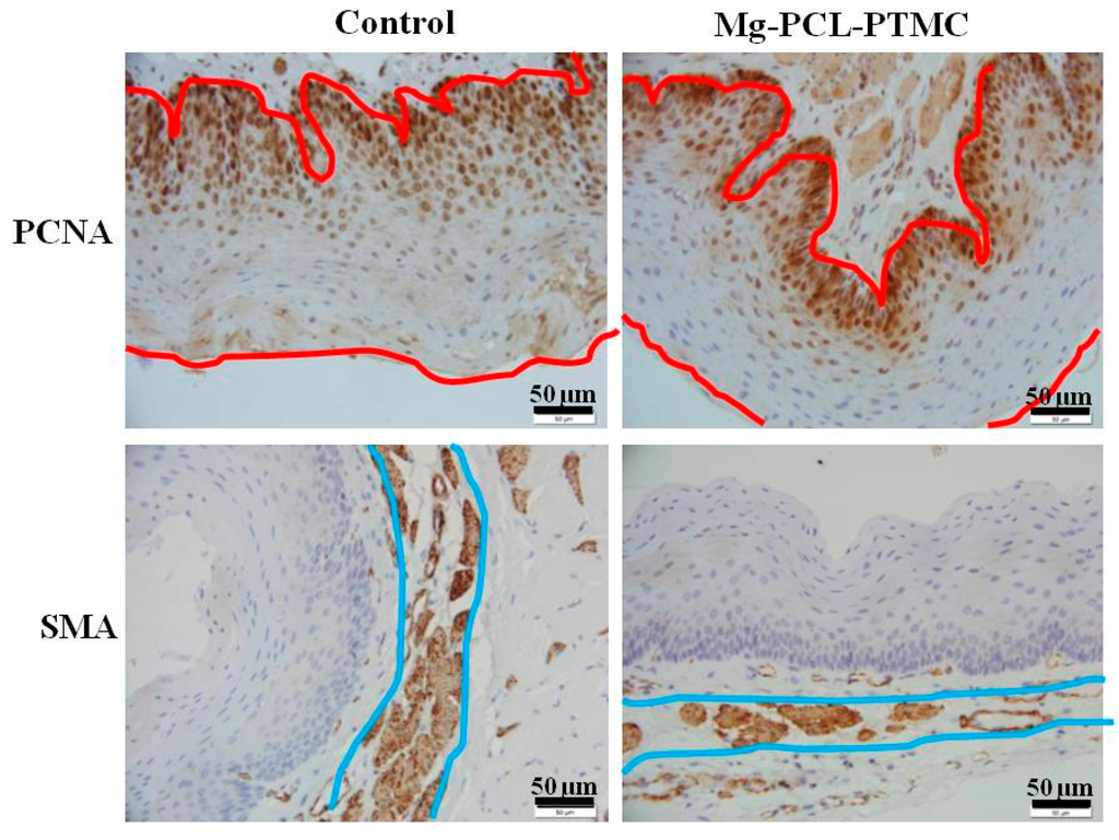 HE staining revealed significantly less esophageal wall remodeling in the magnesium-(PCL-PTMC) stent group than in the control group. The inflammation scores at four weeks in the magnesium-(PCL-PTMC) stent group were similar to those in the control group (p > 0.05). PCNA-positive cells (squamous epithelial cells) were mainly found in the epithelial layer; squamous epithelial cells located near the lumen and close to the stent were mostly negative for PCNA. The epithelial layer, as shown on PCNA staining, was much thinner in the stent group than in the control group. Immunostaining revealed that the SMA layer in the media was thinner in the magnesium-(PCL-PTMC) stent group than in the control group (p < 0.05). Masson staining revealed that collagen was mainly localized in the submucosa, similar between the stent and the control groups at each follow-up time point, indicating that the tissue reaction followed by stent dilation injury and degradation was similar to that in the control (Figure 6 and Figure 7).