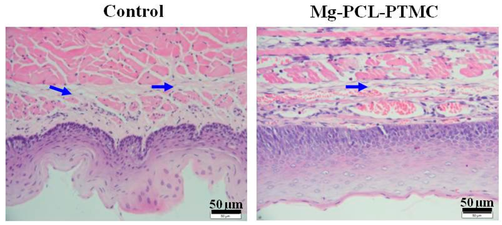 HE trichrome staining shows collagen deposition in the submucosa in the control and magnesium-(PCL-PTMC) stent groups. p < 0.05 for comparisons between the control and magnesium-(PCL-PTMC) stent groups.