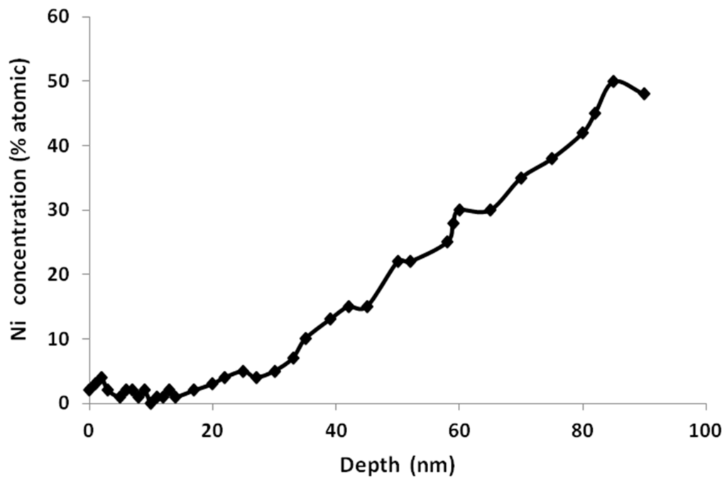 For untreated samples, the Ti 2p photopeaks obtained indicate the presence of a stoichiometric TiO2, as well as Ti0 signals indicating that protective oxide layer thickness is very thin (below the depth limit of XPS). However, for the oxidized samples, it can clearly be observed that Ti is mostly present as Ti4+ and the Ti0 signal is practically negligible showing that the oxide layer has grown. Depth profiling reveals that the Ti+4 and Ti+3 species comprise the outermost of the oxide layer; the remaining oxide layer, close to the metal–oxide interface, consists of Ti+2 and Ti0 Finally, the depth profiling of the Ni as a function of sputtering time is plotted in Figure 1, where a zone depleted in Ni (<3 at %) is formed up to approximately 25 nm in depth. It is expected that the presence of a relatively thicker TiO2 layer, free of nickel, could prevents the nickel ions release to the surrounding tissues.