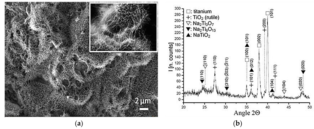 (a) SEM micrograph showing a microporous layer of sodium titanate on NiTi surface (alloy A); and (b) GI-XRD pattern of sodium titanate layer.