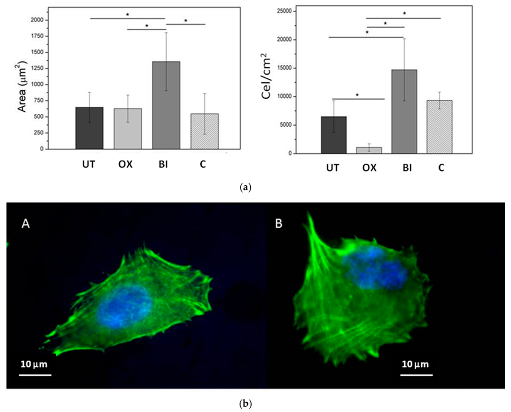 (a) Cell spreading and cell number after 2 h of culture corresponding to different surfaces: C, Teflon; UT, untreated Ti; OX, oxidized Ti; and BI, bioactive Ti; (b) Representative fluorescence microscopy images of MG63 cells on untreated NiTi (A) and bioactive NiTi (B) after seven days of incubation (alloy A).
