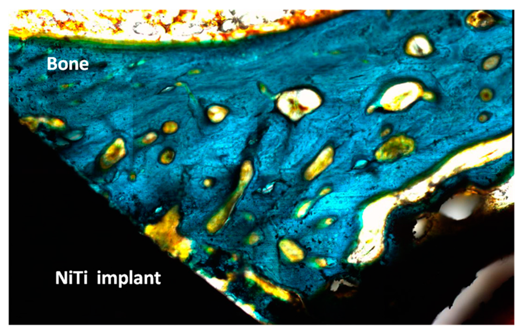 Concerning toxicity, it is well reported that nickel ions release from the surface (Ni dissolution or wear debries) may cause some allergic reaction and biocompatibility problems [4,5,6]. The protective nickel-titanium oxide layer acts as a barrier to chemical attack and corrosion and confines the diffusion of Ni ions, however, this oxide layer can be depleted by wear, corrosion and fatigue. By means of surface oxidation (laser or plasma source ion implantation techniques), it is possible to reduce the amount of Ni ions leaching from the surface of NiTi implant to negligible amounts [7,8]. Nevertheless, one of the major issues has proven to be an inadequate interaction between the NiTi SMA and the surrounding natural tissue leading to foreign body reactions [9]. For example, the appearance of a dense layer of fibrotic connective tissue at interface of bone–implant could generate weak anchorage between the implant and adjacent bone leading to micro-motion and, finally, loosening of the implant. Therefore, preparation of a bioactive layer, free of nickel, is regarded as a critical issue for its greater acceptability and reliability in clinical applications.