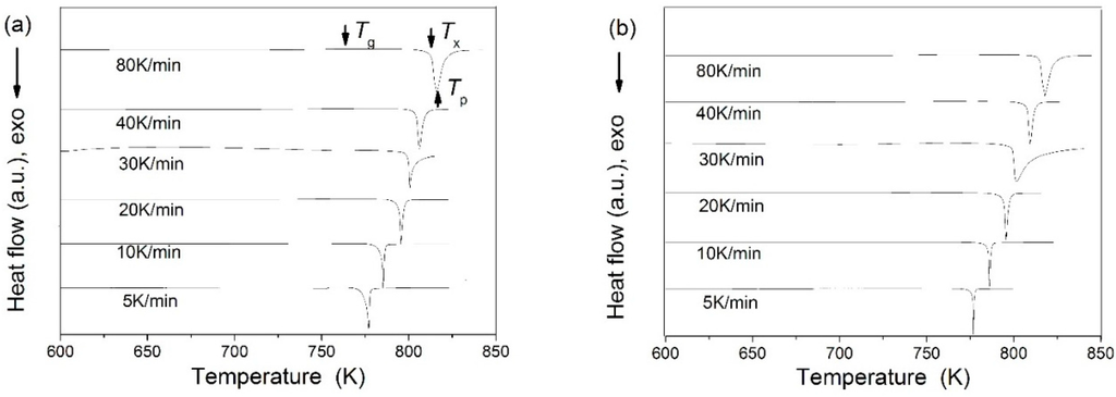 It is obvious from the DSC curves, as shown in Figure 2, that both glass transition and sharp crystallization events can be clearly observed at heating rates of 5–80 K∙min−1. It further confirms the glassy nature of these Zr-based BMGs. In addition, there is a single crystallization event in the studied temperature region for all heating rates, indicating one step crystallization procedure for all Zr-based BMGs.