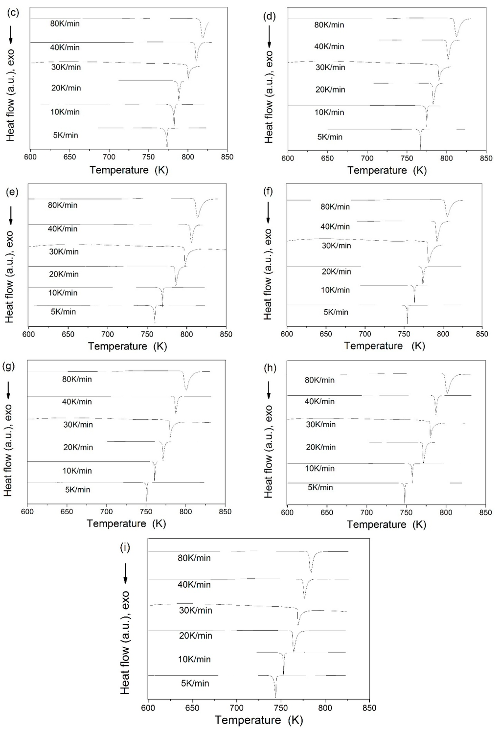 DSC curves for Φ2 mm Zr-Al-Ni-Cu bulk metallic glasses at heating rates of 5–80 K∙min−1: (a) Zr51Al14.2Ni15.9Cu18.9 BMG; (b) Zr51.5Al13.6Ni14.9Cu20 BMG; (c) Zr52Al12.9Ni13.8Cu21.3 BMG; (d) Zr52.5Al12.2Ni12.6Cu22.7 BMG; (e) Zr53Al11.6Ni11.7Cu23.7 BMG; (f) Zr53.5Al10.9Ni10.6Cu25 BMG; (g) Zr54Al10.2Ni9.4Cu26.4 BMG; (h) Zr54.5Al9.6Ni8.4Cu27.5 BMG and (i) Zr55Al8.9Ni7.3Cu28.8 BMG.