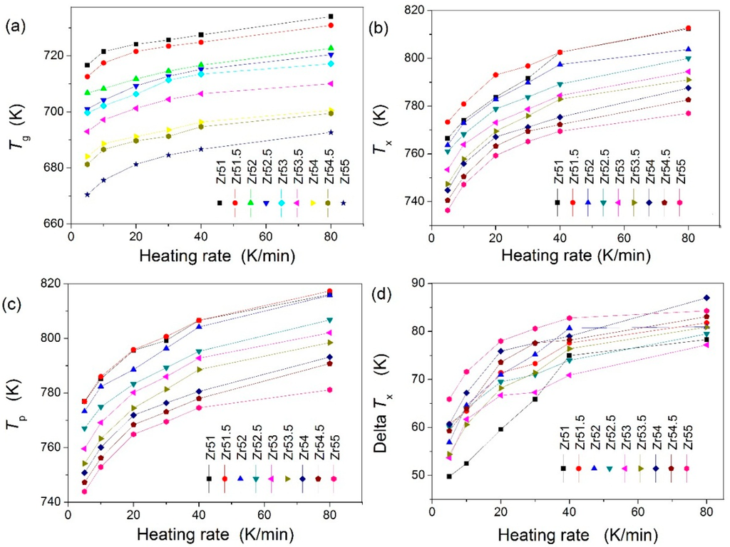 The characteristic temperatures including glass transition temperature (Tg), crystallization temperature (Tx), crystallization peak temperature (Tp) and supercooled liquid region (ΔTx = Tx − Tg) were carefully determined according to the DSC results (see Figure 2). The dependences of the characteristic temperatures on the heating rate are shown in Figure 3. These characteristic temperatures all increase with increasing heating rate for the studied Zr-based BMGs. The Tg decreases with increasing Zr content for all heating rates, as shown in Figure 3a. Both Tx and Tp firstly increase with increasing Zr content and then decrease when the Zr content exceeds 51.5 at % for all heating rates, as shown in Figure 3b,c. However, there are complex relationships between the ΔTx and the Zr content for the studied heating rates, as shown in Figure 3d. The ΔTx for Zr51Al14.2Ni15.9Cu18.9 BMG is the smallest among the studied Zr-based BMGs when the heating rate is less than 30 K∙min−1. When the heating rate exceeds 30 K∙min−1, the ΔTx for Zr53Al11.6Ni11.7Cu23.7 BMG is the smallest among the studied Zr-based BMGs. The ΔTx for Zr55Al8.9Ni7.3Cu28.8 BMG is the largest among the studied Zr-based BMGs when the heating rate is less than 40 K∙min−1. Zr54Al10.2Ni9.4Cu26.4 BMG has the largest ΔTx among the studied Zr-based BMGs at a heating rate of 80 K∙min−1.