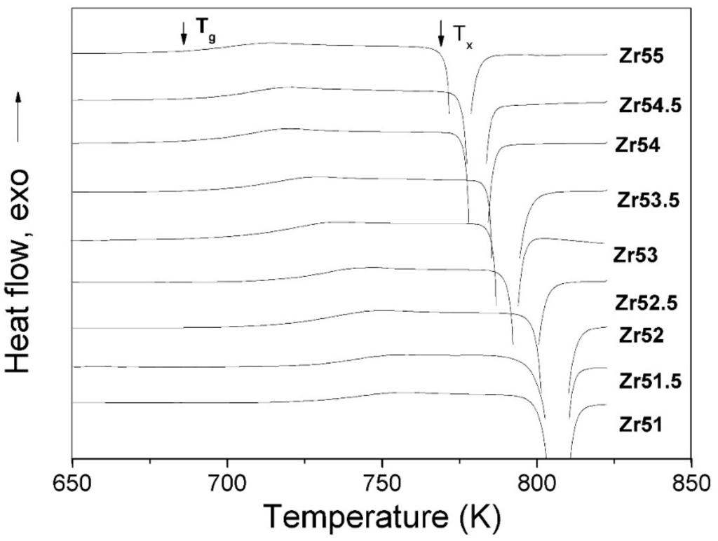 DSC curves of all studied Zr-based BMGs at a heating rate of 30 K∙min−1.