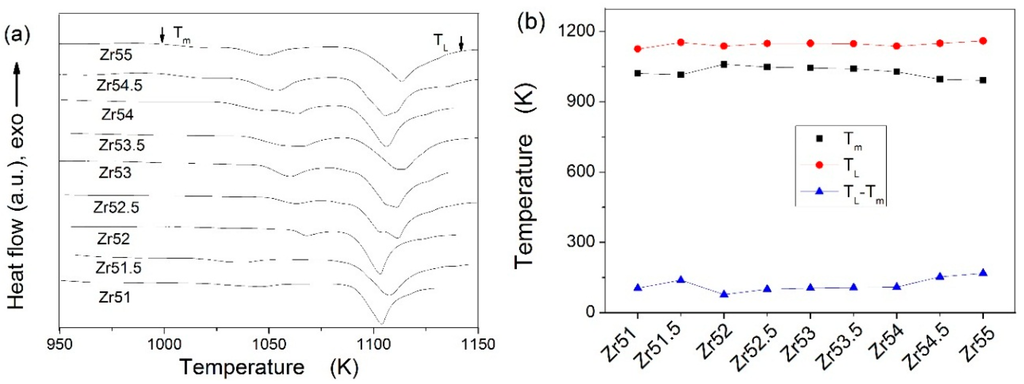 Melting curves at a heating rate of 30 K∙min−1 for the studied Zr-based BMGs (a); and dependences of the Tm, TL, and TL-Tm on the Zr content (b).