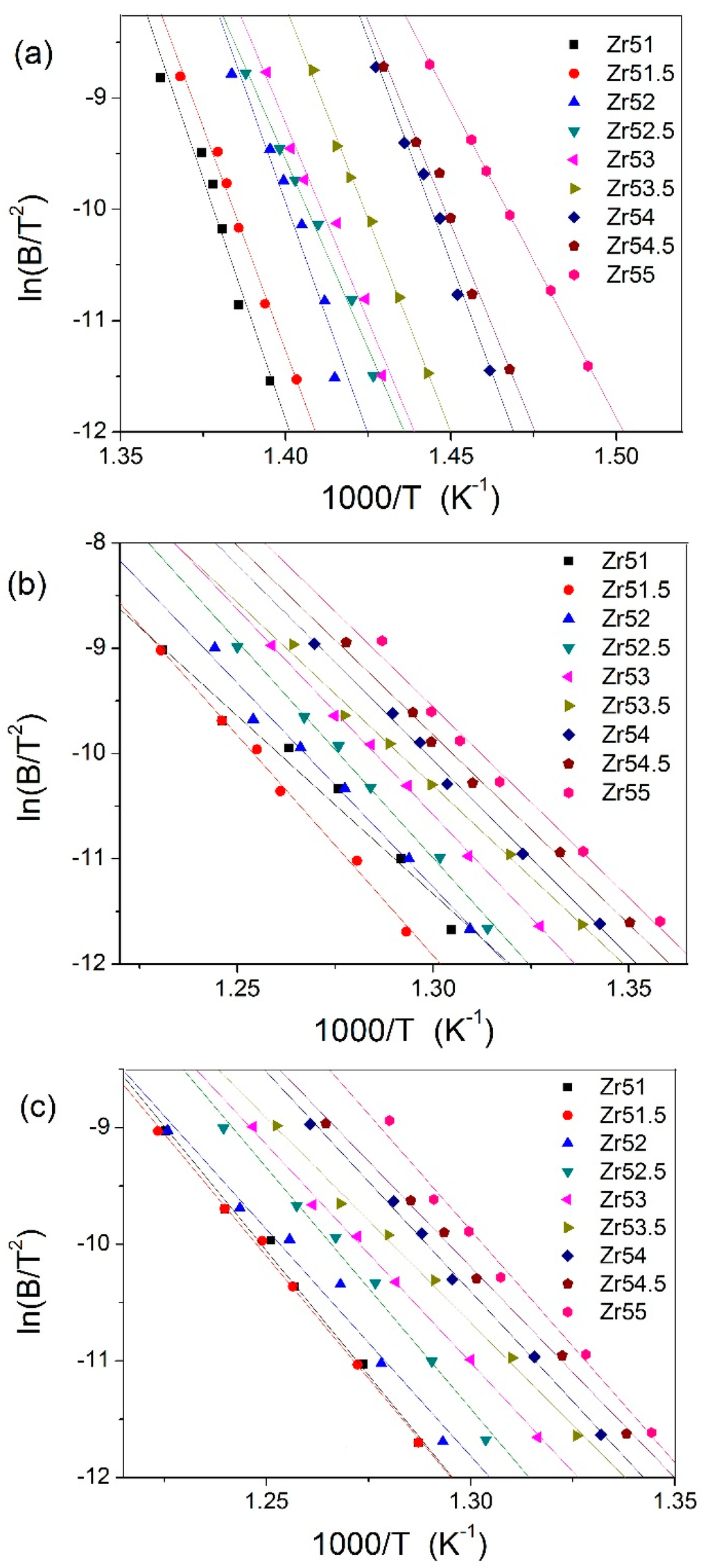 The activation energies of Tg, Tx, and Tp (Eg, Ex, and Ep) are calculated by Kissinger equation [] and the corresponding fitting curves are presented in Figure 6. It is obvious from Figure 6 that the experimental data can be better fitted by Kissinger equation. The estimated Eg and Ex are listed in Table 1.