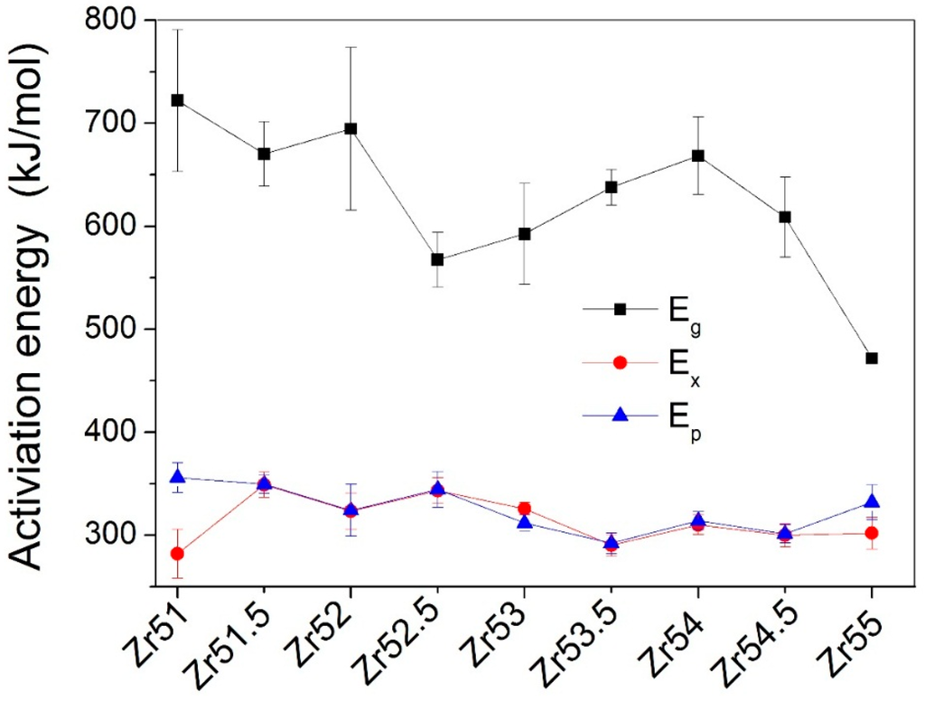 The dependences of the Eg, Ex, and Ep on the Zr content are shown in Figure 7. It is clearly observed in Figure 7 that the dependences of the Eg, Ex, and Ep on the Zr content are all complex. The Eg is largest for Zr51Al14.2Ni15.9Cu18.9 BMG, while smallest for Zr55Al8.9Ni7.3Cu28.8 BMG. The Ex is smallest for Zr51Al14.2Ni15.9Cu18.9 BMG, while largest for Zr51.5Al13.6Ni14.9Cu20 BMG. The Ep is largest for Zr51Al14.2Ni15.9Cu18.9 BMG, while smallest for Zr53.5Al10.9Ni10.6Cu25 BMG.