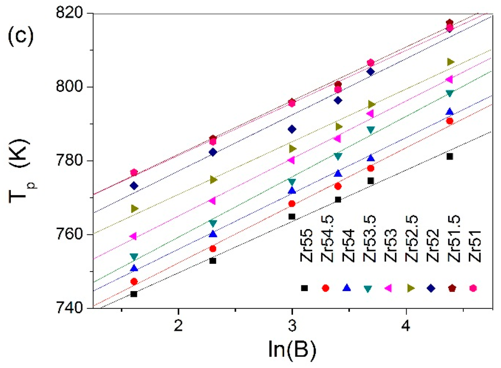 In addition, the dependences of the characteristic temperatures (Tg, Tx and Tp) on the lnB (B is heating rate) were investigated, as shown in Figure 8. It was found from Figure 8 that the characteristic temperatures (Tg, Tx and Tp) and the lnB can be well fitted by the Lasocka’s equation []: (T is characteristic temperature, α and β are constants). Obviously, β can reflect the sensitivity of the characteristic temperature to the B. The higher the β, the more is the sensitivity of the characteristic temperature to the B. The βg and βx values are listed in Table 1.