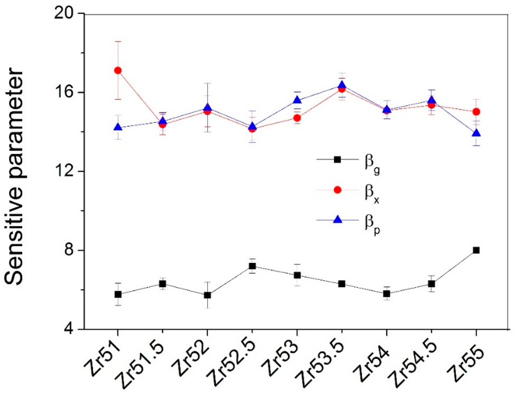 The dependences of the β values on the Zr content are presented in Figure 9. Both βx and βp are larger than the βg, indicating that the crystallization procedure is more sensitive to the heating rate than the glass transition procedure. The βg is smallest for Zr52Al12.9Ni13.8Cu21.3 BMG, while largest for Zr55Al8.9Ni7.3Cu28.8 BMG. It indicates that the glass transition to the heating rate for the latter has largest sensitivity, while smallest for the former. The βx is largest for Zr51Al14.2Ni15.9Cu18.9 BMG, while smallest for Zr52.5Al12.2Ni12.6Cu22.7 BMG. The βp is smallest for Zr55Al8.9Ni7.3Cu28.8 BMG, while largest for Zr53.5Al10.9Ni10.6Cu25 BMG.