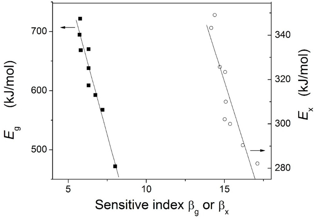 Dependences of the activation energies (Eg, Ex, and Ep) on the Zr content.