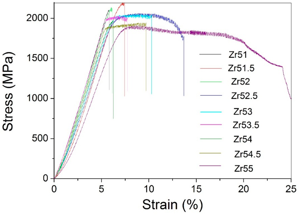 Room-temperature uniaxial compression stress–strain curves for the studied Zr-based BMGs.