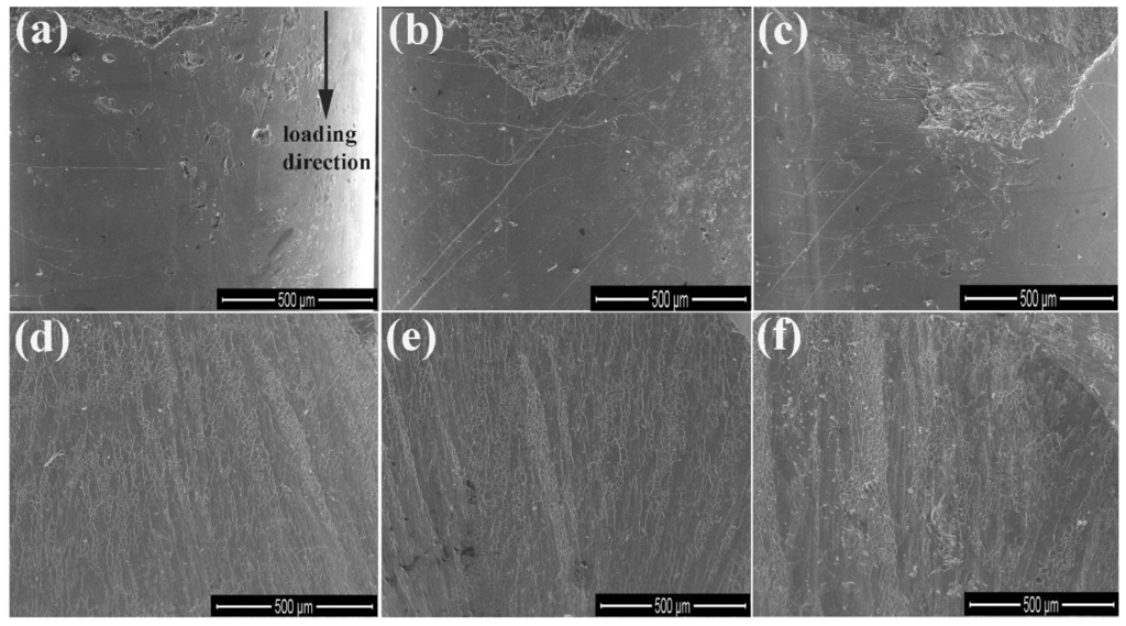 Typical SEM images of side surfaces (a–c) and fracture surfaces (d–f): (a,d) Zr51Al14.2Ni15.9Cu18.9, Zr51.5Al13.6Ni14.9Cu20, Zr52Al12.9Ni13.8Cu21.3, and Zr54Al10.2Ni9.4Cu26.4 BMGs; (b,e) Zr53Al11.6Ni11.7Cu23.7 and Zr54.5Al9.6Ni8.4Cu27.5 BMGs; and (c,f) Zr52.5Al12.2Ni12.6Cu22.7 and Zr55Al8.9Ni7.3Cu28.8 BMGs.
