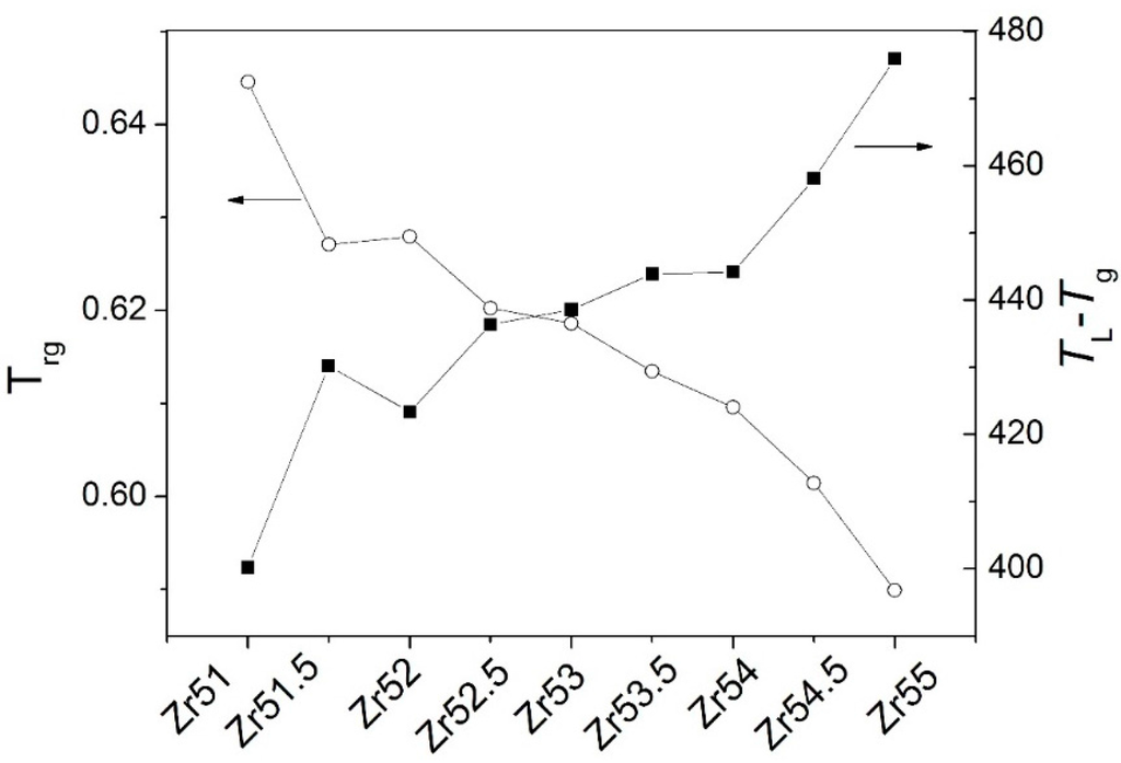 As shown in Figure 11 and Table 1, there is large different plasticity for the studied Zr-based BMGs. The reasons would be as follows. Firstly, high GFA is advantageous of the homogeneous distribution of the atoms in alloys [], indicating that the structural heterogeneity in the atomic scale would be difficult for the formation in the BMG with high GFA. The growing results have claimed that the heterogeneity would generally result in good plasticity [,,,]. In addition, Lu and Liu [] found that the reduced glass transition temperature Trg (=Tg/TL) is a good indicator for the GFA of the glass forming alloy. The larger the Trg, the higher is the GFA of the BMG. It is obvious from Figure 13 and Table 1 that the Trg nearly decreases with increasing Zr content. It indicates that the GFA decreases with increasing Zr content.