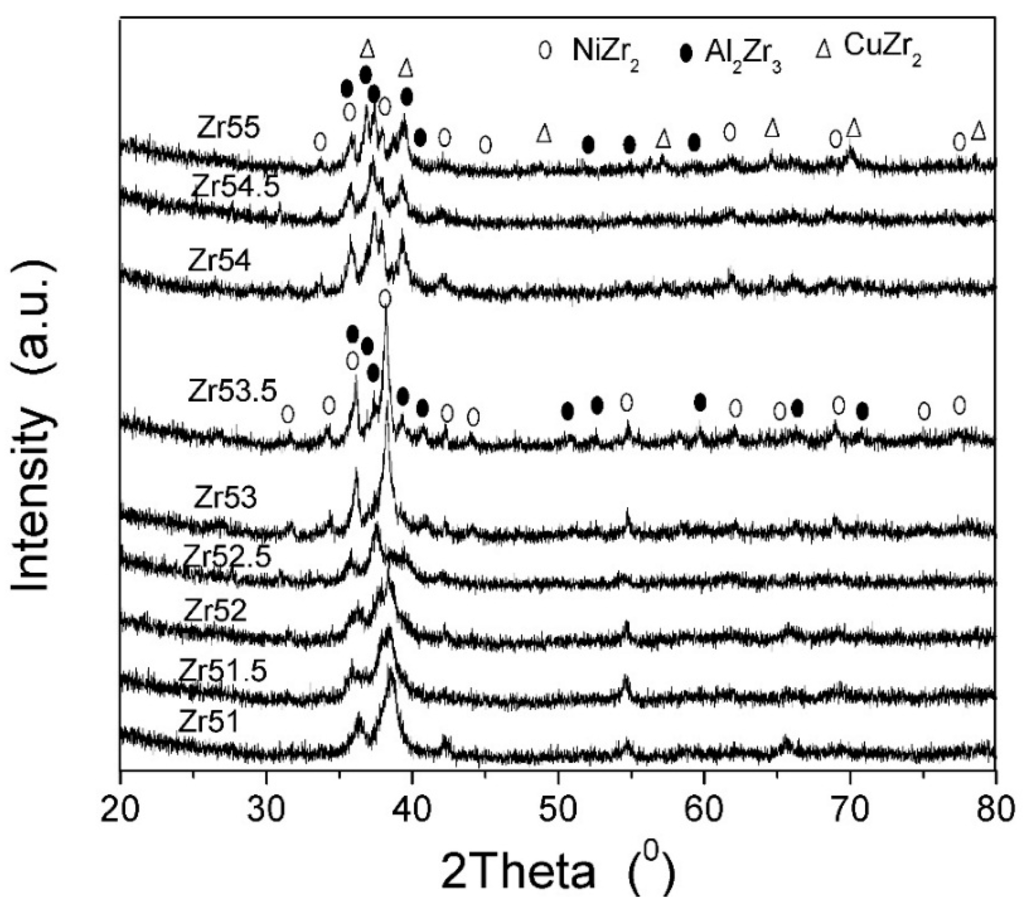 Figure 1 presents XRD patterns for Φ8 mm Zr-based glass forming alloys, which indicates that these Φ8 mm Zr-based glass forming alloys are in glassy states because no apparent crystalline Bragg peaks are observed.
