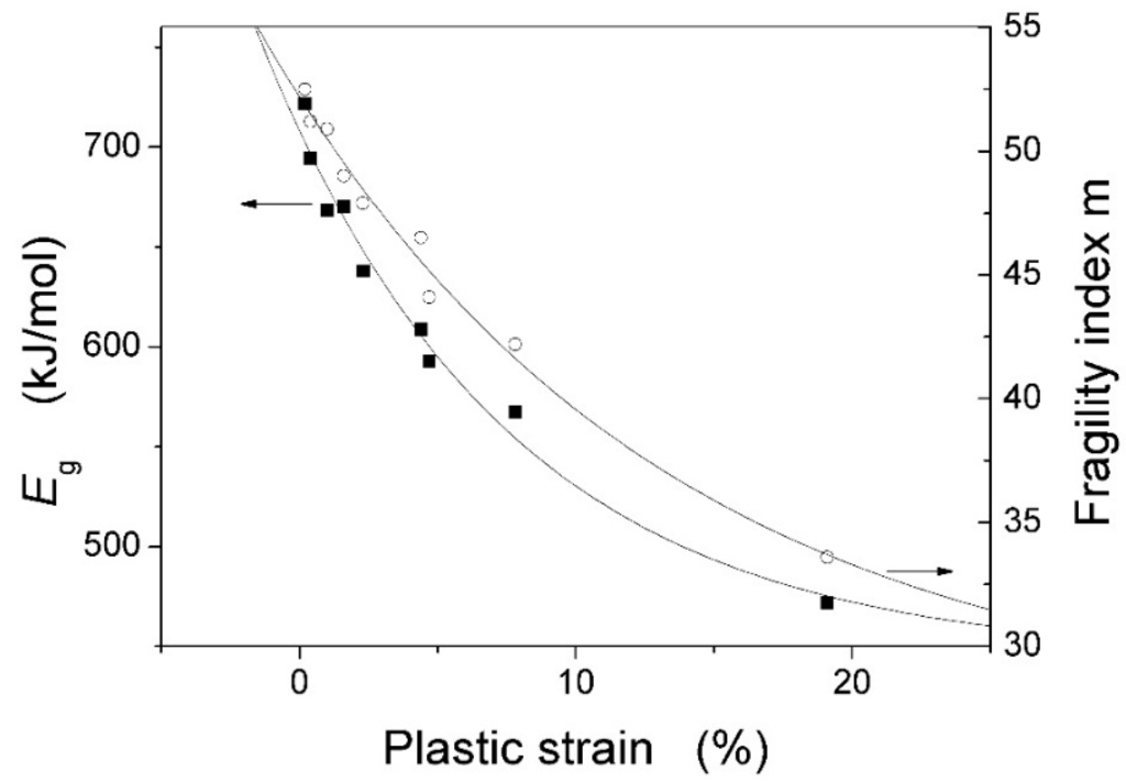 In addition, the activation energy for the glass transition Eg is equal to that for plastic flow Ep []. Low Tg or Eg would easily lead to yielding or plastic flow of the BMG. As shown in Table 1, both Tg and Eg are largest for Zr51Al14.2Ni15.9Cu18.9 BMG and smallest for Zr55Al8.9Ni7.3Cu28.8 BMG. Interestingly, the εp increases with decreasing Eg for the studied Zr-based BMGs, as shown in Figure 16. At the same time, large ΔTx indicates good stability of supercooled liquid, resulting in large plastic flow for the BMG. It is clearly seen from Table 1 that the ΔTx is largest for Zr55Al8.9Ni7.3Cu28.8 BMG and smallest for Zr51Al14.2Ni15.9Cu18.9 BMG. Moreover, the m value can be considered as the activation energy of the flow for the supercooled liquid and the steepness of the change of the viscosity (η) with the temperature (T) at Tg according to []: The smaller is the m, the lower is the activation energy and the longer is the time for the flow of the supercooled liquid. That is to say, the small m is advantageous of the plastic flow of the metallic glass and would result in large plasticity. As shown in Table 1, the m is largest for Zr51Al14.2Ni15.9Cu18.9 BMG and smallest for Zr55Al8.9Ni7.3Cu28.8 BMG. In fact, it can be clearly seen from Figure 16 that the εp increases with decreasing m for the studied Zr-based BMGs. In a word, the plasticity is largest for Zr55Al8.9Ni7.3Cu28.8 BMG and smallest for Zr51Al14.2Ni15.9Cu18.9 BMG.