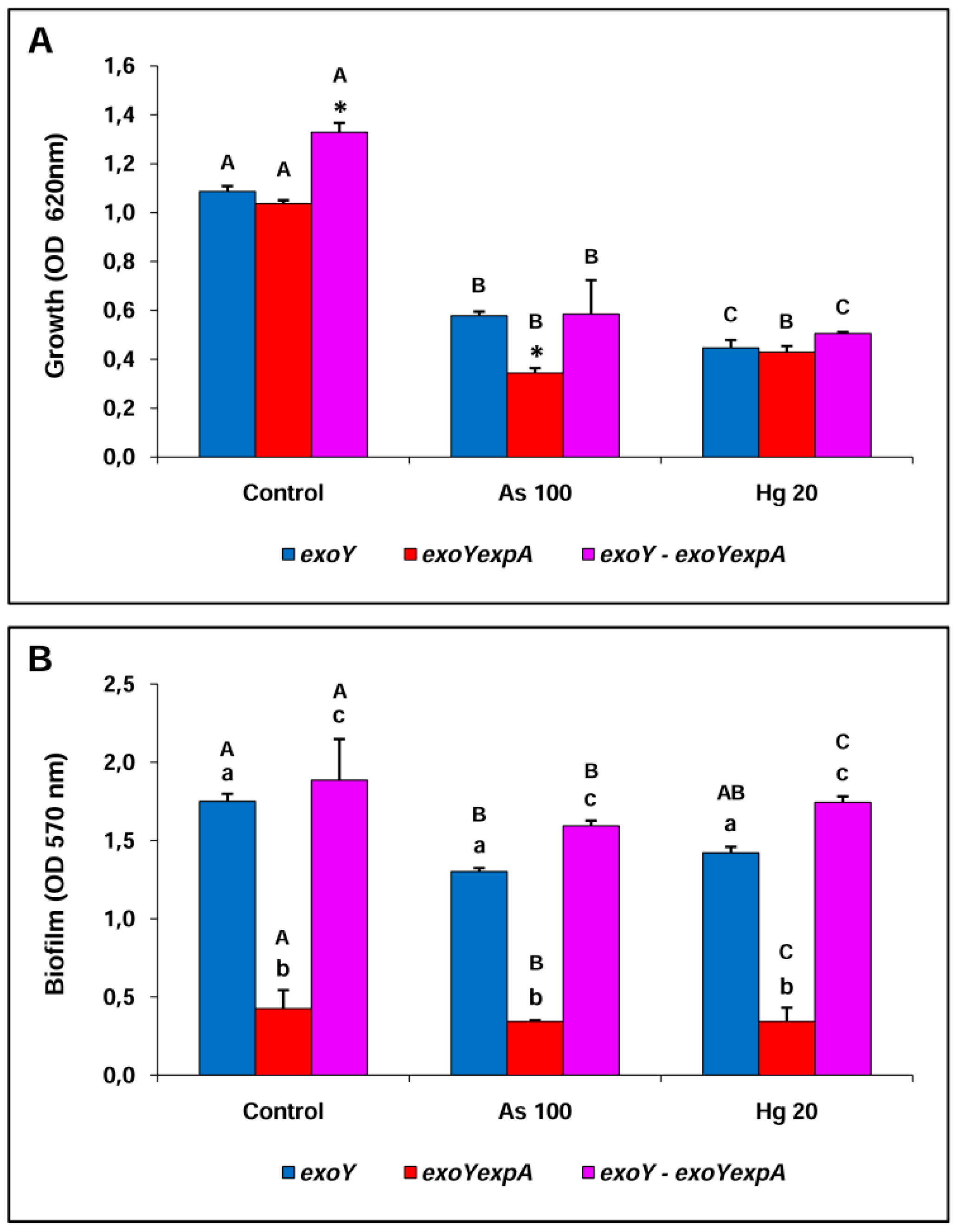 | Rm8530 exoYexpA | 2.93 × 106aA | 4.75 × 108aA* | 1.17 × 104aB | 2.08 × 106bcB* | 1.90 × 104aB | 2.04 × 106bcB* |