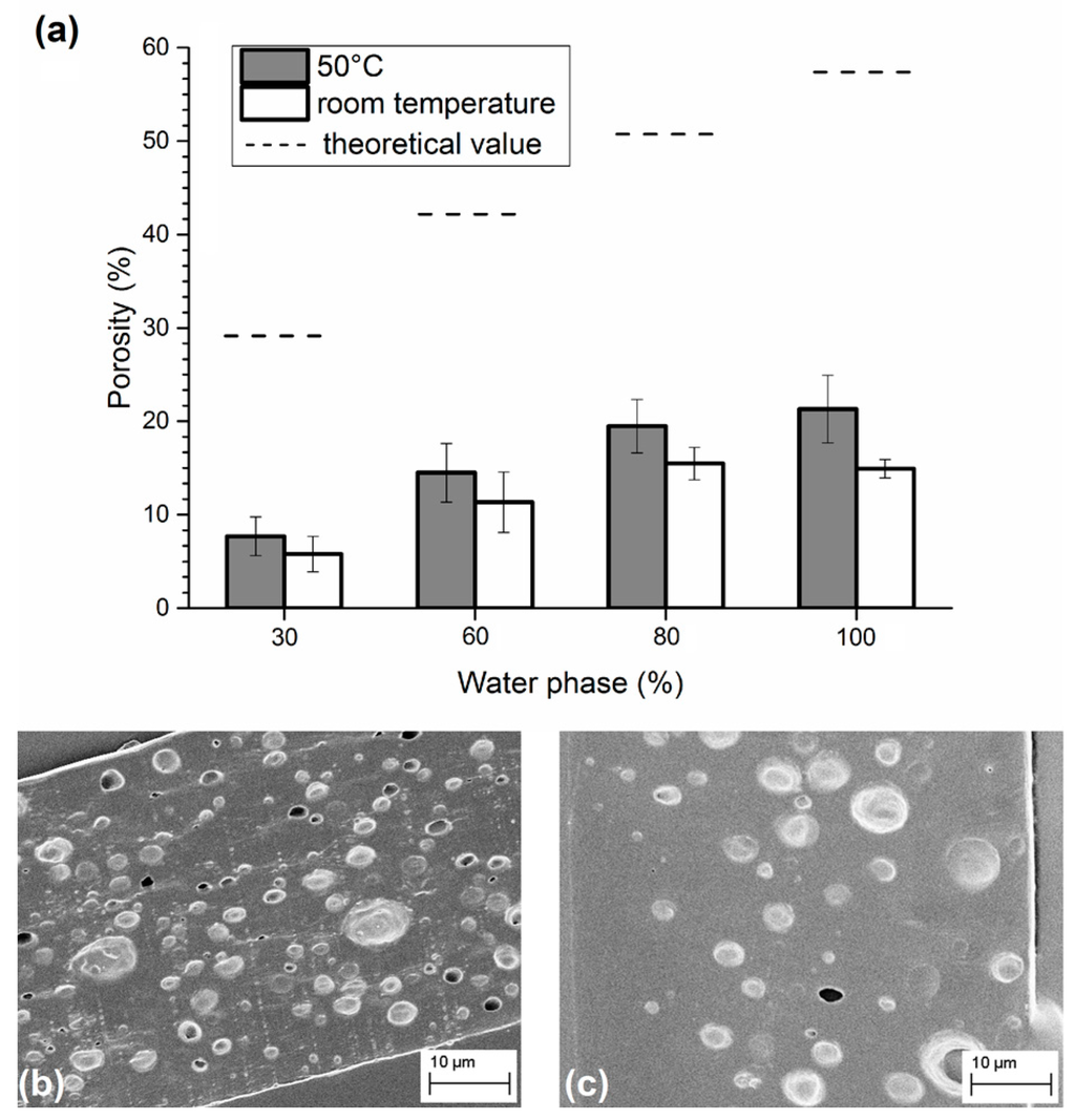 (a) Porosity obtained in emulsions containing different amounts of water phase and consolidated at 50 °C or at room temperature. SEM images of sliced matrices obtained from emulsions with 80% of water phase and solidified at (b) 50 °C; and (c) at room temperature.