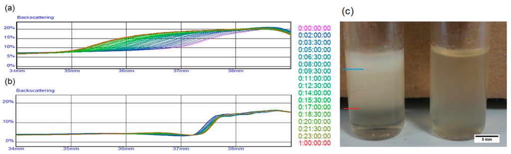 Stability comparison of emulsions in liquid state through backscattering analysis of (a) the sample without maltose and (b) the sample with maltose; (c) Comparison between emulsions one week after their preparation. The blue line in the figure indicates the level of water separated from the emulsion, while the red line marks a region deprived of water microdroplets.