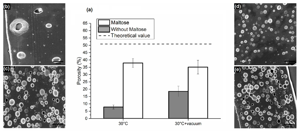 In a second set of samples, water content was fixed at 80% to make the comparison between samples with and without maltose possible, since increasing water to 100% did not entail an improvement in porosity in the case of the absence of maltose. The consolidation process was carried out at 30 °C only or at 30 °C in a vacuum. We chose to work at a mild temperature in order to guarantee safety conditions to thermo-labile biomolecules preloaded in the matrix. In particular, we compared samples with and without maltose after consolidation at 30 °C; SEM images showed a porosity, which, in the presence of maltose and in the absence of a vacuum, was about seven times higher than samples with no maltose (Figure 3). Particularly, despite an evaporation time, which is much longer than in the case of dehydration at 50 °C, maltose seems to limit the drop aggregation and phase separation, bringing the level of porosity between 30% and 40%. Together with the decisive influence of maltose, the contribution of a vacuum during consolidation was also analyzed. As can be seen in Figure 3f,g, there is a significant improvement in the distribution of the pores in the case of samples dried in a vacuum, even if there is not a great difference in the level of porosity for emulsions containing maltose. A vacuum accelerates solvent extraction, requiring less time to drop coalescence before the immobilization of porosity. A 3D analysis of the pores by loading the water phase with TRITC-albumin and carrying out a confocal analysis was also performed and reported in the Supplementary Materials (Figures S1–S3).