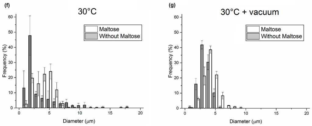 As a confirmation of the observed higher creaming rate of the emulsion without maltose, by assuming the mean values of the distributions in Figure 3 as radii for the droplets and the values in Table 2 as the densities, from Equation (3), it is possible to obtain
