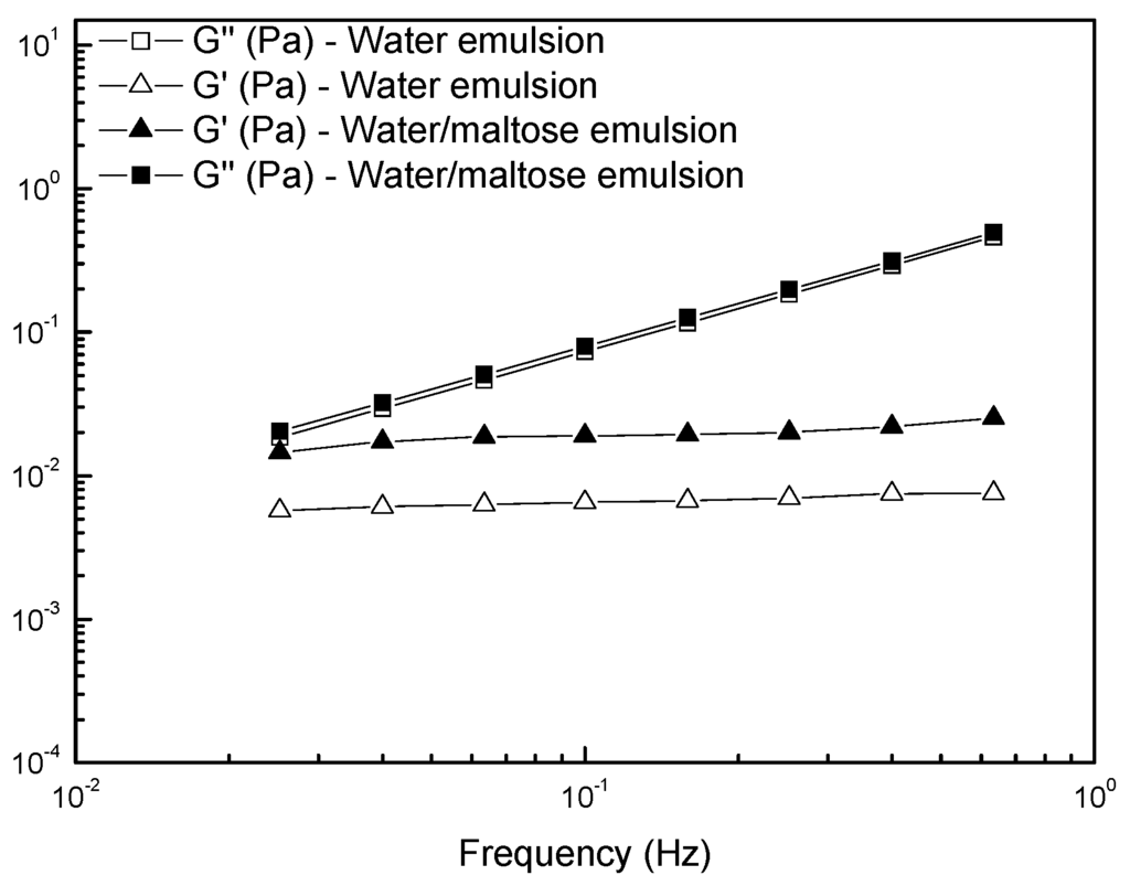 In Figure 4, we reported the results of the frequency sweeps carried out on the emulsions in terms of storage (G’) and loss (G’’) moduli as functions of the oscillations frequency. In almost the whole range of investigated frequencies, the samples showed a viscous liquid-like behavior (G’’ > G’) because of the low volume fraction of the dispersed phase. The loss modulus trend was almost the same for the two studied samples, the viscous component being mainly due to the continuous phase. For the storage modulus, a higher value for the emulsion containing maltose was found: the elastic component, due to the surface contribution arising from the dispersed phase, was higher in the presence of maltose dissolved in the dispersed domains. This latter evidence is in agreement with the lower tendency of the maltose-containing system to kinetic destabilization by means of coalescence, which would increase the size of the drops with a further acceleration of the creaming process.