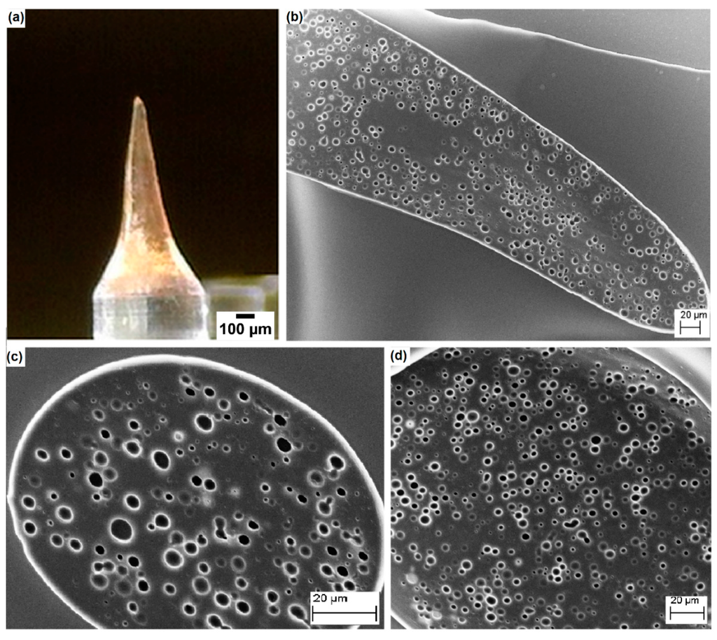 (a) Electro-drawn microneedle laying on a PDMS pillar. SEM images of (b) a longitudinal section; (c) transversal sections near the tip; and (d) near the base of the microneedle. Needle structure shows the same porosity of a flat layer homogeneously distributed in all its parts.