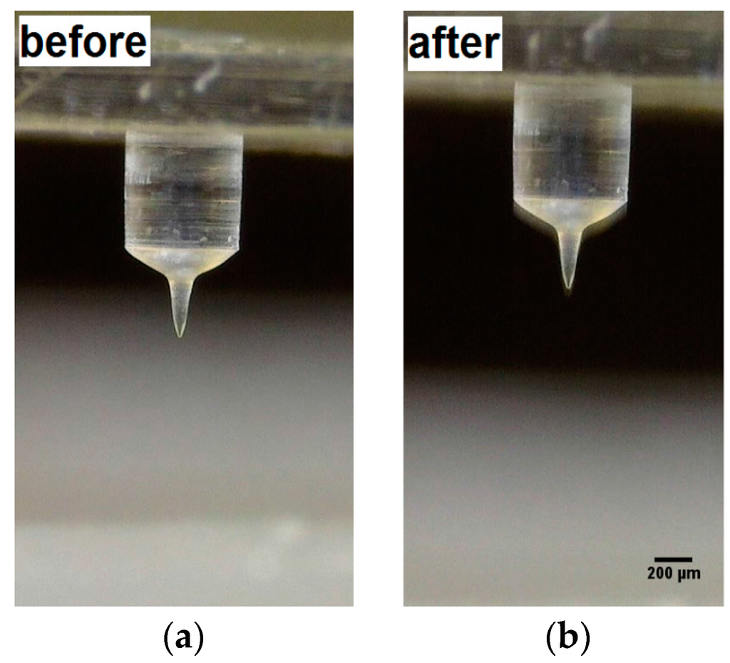 Microneedle obtained by electro-drawing of emulsion containing maltose (a) before; and (b) after indentation in paraffin wax.