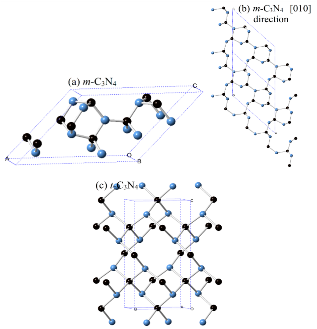 The crystal structures of: m-C3N4 (a,b); and t-C3N4 (c) (black spheres denote carbon atoms, blue spheres denote nitrogen atoms).