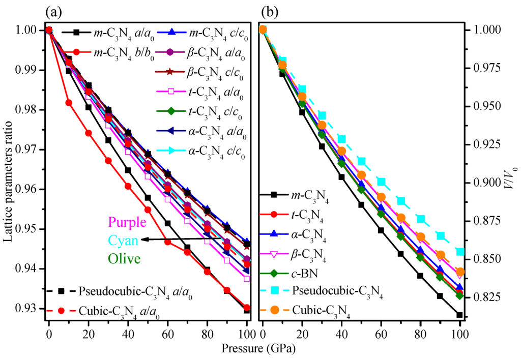 The calculated pressure–volume relationships of m-C3N4 and t-C3N4, together with diamond, c-BN, and other C3N4 allotropes, are shown in Figure 2. The highest incompressibility along the c-axis is due to m-C3N4 in the C3N4 allotropes, while along the c-axis, m-C3N4 yields the lowest incompressibility at pressures from 0 to 87 GPa; along the b-axis, m-C3N4 yields the lowest incompressibility at pressures from 87 to 100 GPa. For the crystal structure, pseudocubic-C3N4 has the greatest incompressibility in the C3N4 allotropes discussed above, while m-C3N4 has the weakest incompressibility. However, the incompressibility of t-C3N4 is greater than that of c-BN and the incompressibility of m-C3N4 is weaker than that of c-BN.