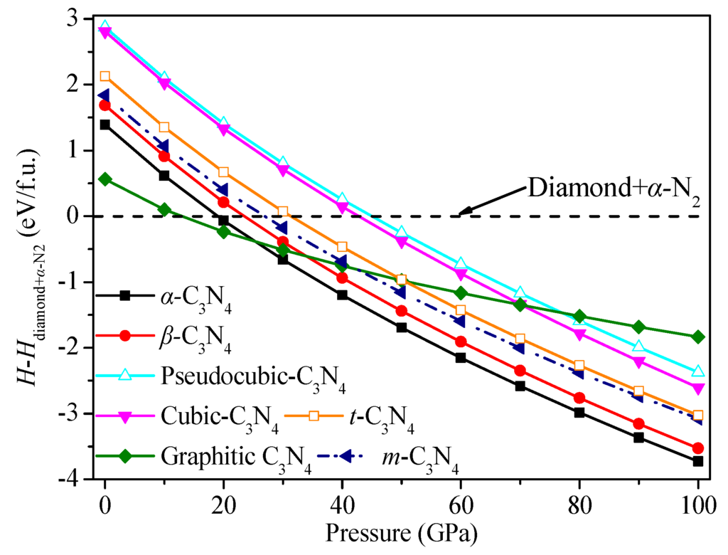 In an effort to assess the thermodynamic stability of two novel C3N4 allotropes, enthalpy change curves with pressure for various structures were calculated, as presented in Figure 3. The dashed line represents the enthalpy of the summary of diamond and α-N2. It can be clearly seen that g-C3N4 has the lowest minimum value of enthalpy, which is in good agreement with previous reports and supports the reliability of our calculations [43]. Pseudocubic-C3N4 has the greatest minimum value of enthalpy. The minimum value of total energy per formula unit of t-C3N4 is slightly larger than that of g-C3N4, α-C3N4, m-C3N4, and β-C3N4 but much smaller than those of pseudocubic-C3N4 and cubic-C3N4, indicating that t-C3N4 and m-C3N4 should be thermodynamically metastable phases.