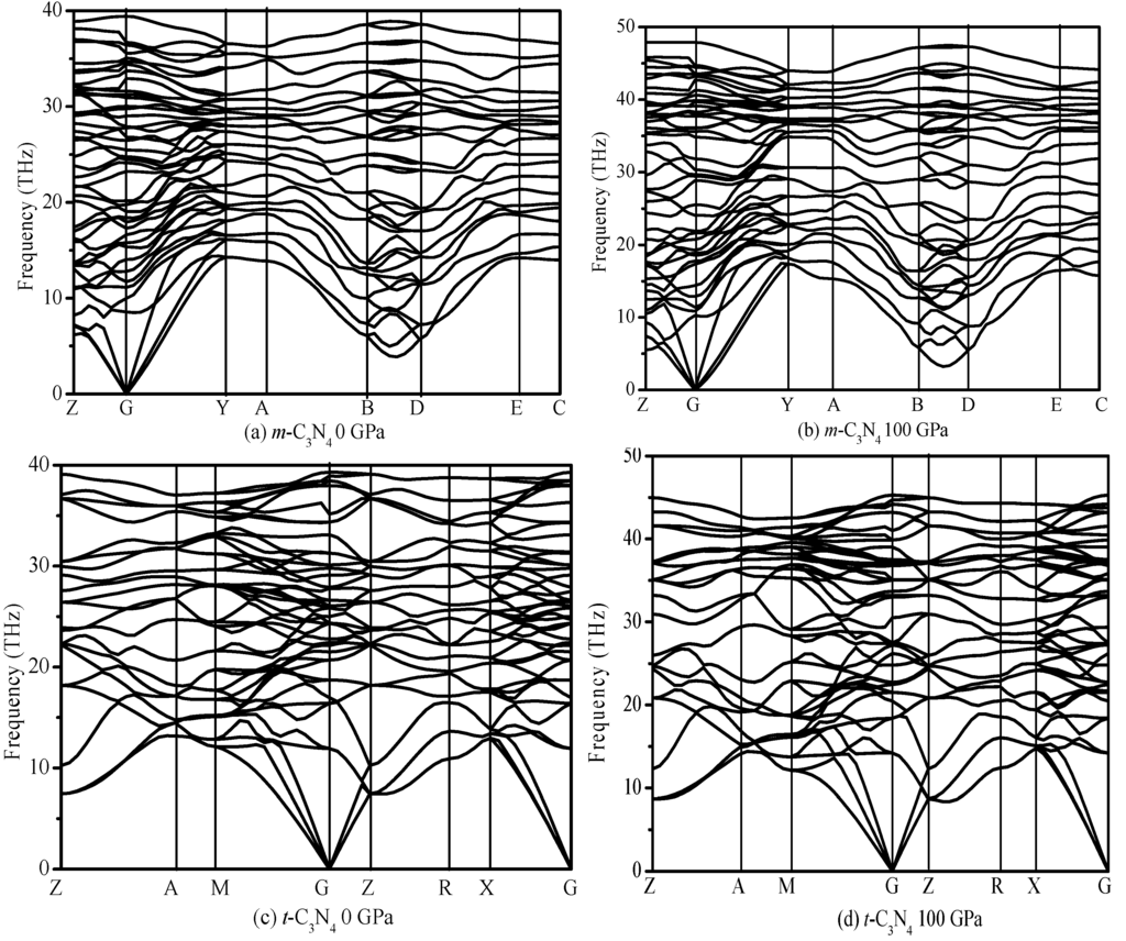 The calculated elastic constants of α-C3N4, β-C3N4, t-C3N4, d-ZB-C3N4, pseudocubic-C3N4, cubic-C3N4 and m-C3N4 are listed in Table 2. Elastic constants under high pressure were also studied. The elastic constants under ambient pressure and high pressure of t-C3N4 and m-C3N4 satisfied the mechanical stability criteria of monoclinic symmetry and tetragonal symmetry. Namely, t-C3N4 and m-C3N4 are mechanically stable. To confirm the stability of t-C3N4 and m-C3N4, their dynamical stabilities should also be studied under ambient pressure and high pressures. Thus, we calculated the phonon spectra for m-C3N4 and t-C3N4 at 0 and 100 GPa, as shown in Figure 4. No imaginary frequencies are observed throughout the whole Brillouin zone, signaling dynamically the stabilities of m-C3N4 and t-C3N4. The calculated elastic modulus of α-C3N4, β-C3N4, d-ZB-C3N4, pseudocubic-C3N4, cubic-C3N4, t-C3N4 and m-C3N4 are listed in Table 3. Bulk modulus B and shear modulus G were calculated by using the Voigt–Reuss–Hill approximation [46,47,48]. The Voigt and Reuss approximation of monoclinic symmetry is calculated using the following equations [44]: