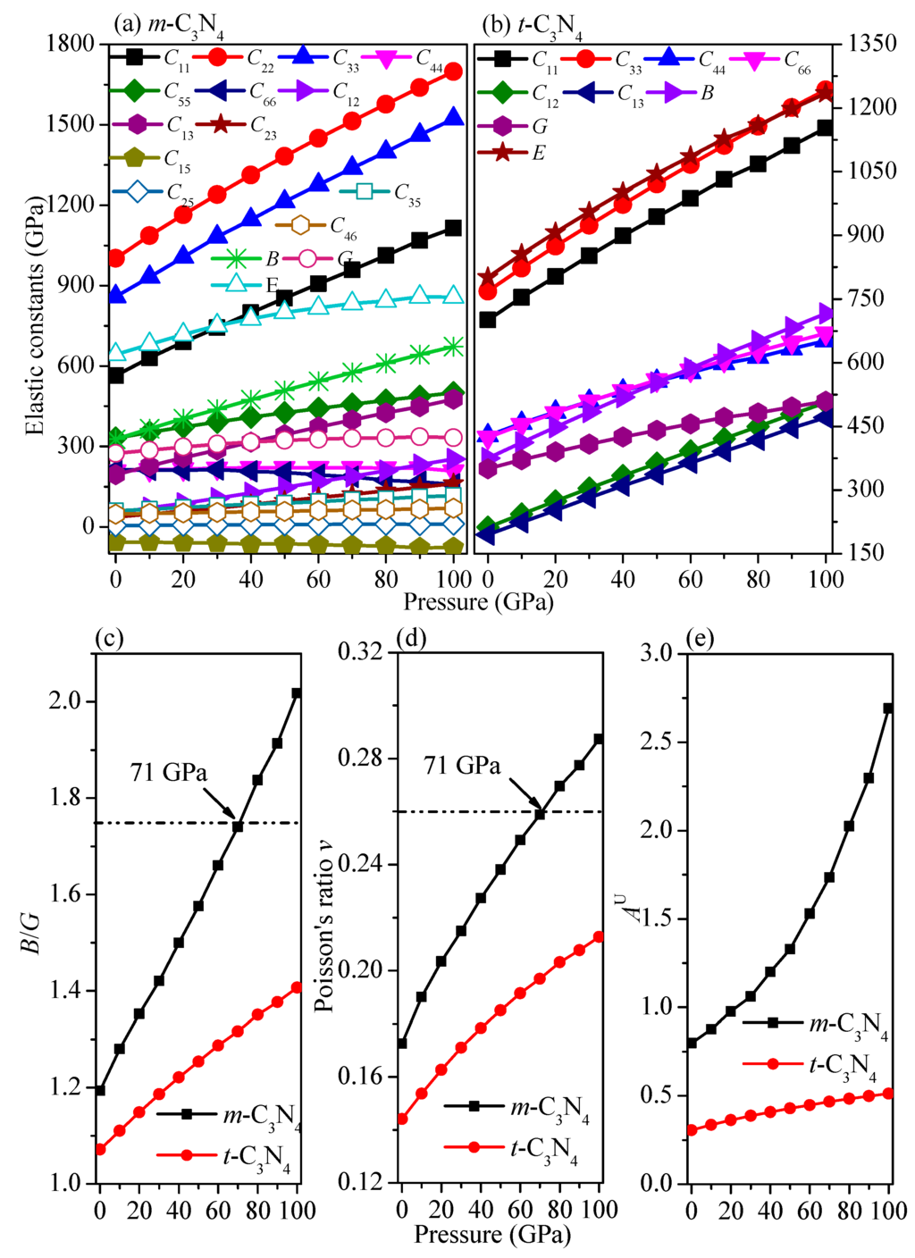 Elastic constants of m-C3N4 (a) and t-C3N4 (b) as a function of pressure, and the ratio B/G (c); Poisson’s ratio v (d); and AU (e) of m-C3N4 and t-C3N4 as a function of pressure.