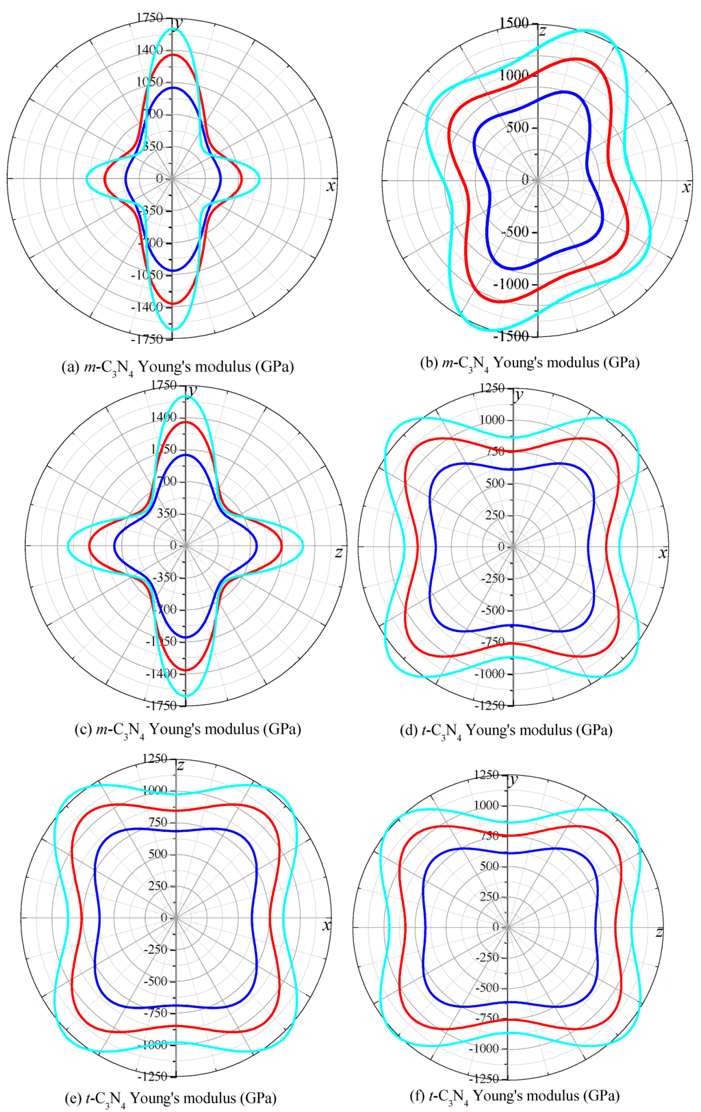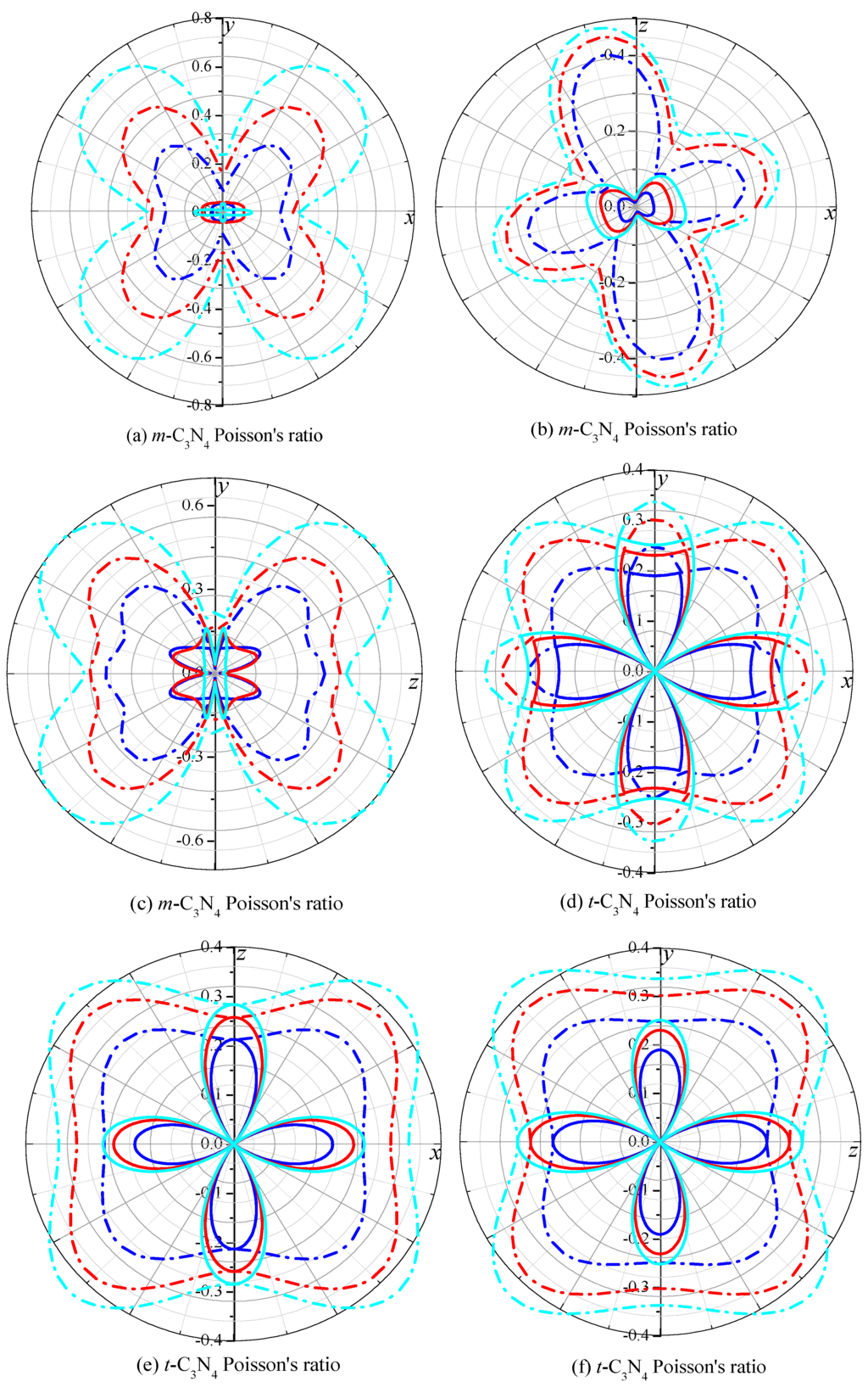 2D representation of Young’s modulus in the xy plane, xz plane and yz plane for: m-C3N4 (a–c); and t-C3N4 (d–f). The blue, red and cyan lines represent Poisson’s ratio at p = 0, 50 and 100 GPa, respectively.
