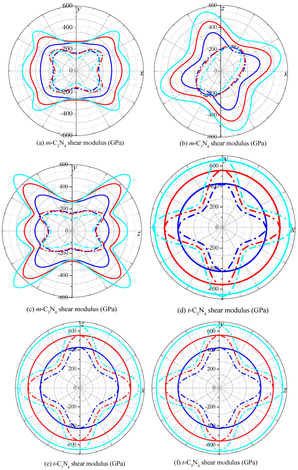 2D representation of shear modulus in the xy plane, xz plane and yz plane for: m-C3N4 (a–c); and t-C3N4 (d–f).