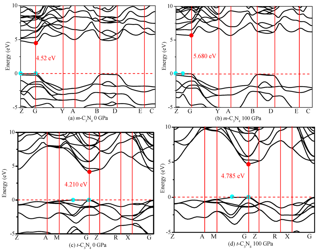 Band theory is one of the most stringent tests of the physics of semiconductors. For example, silicon, calcite and copper all contain similar densities of electrons, but they have different physical properties, all inexplicable without quantum mechanics [61]. Thus, it is necessary to understand the band structure and density of states. The band structures and density of states of m-C3N4 and m-C3N4 at different pressures are shown in Figure 10. The band structure calculations show that m-C3N4 is a quasi-direct band gap semiconductor, with a band gap of 4.52 eV (see Figure 10a), and at 100 GPa, m-C3N4 remains a quasi-direct band gap semiconductor, with a band gap of 5.68 eV. t-C3N4 has a quasi-direct band gap of 4.21 eV at (0.322 0.322 0.0) along the M−Γ direction and Γ point, while the direct band gap is 4.22 eV at the Γ point. At 100 GPa, t-C3N4 has a quasi-direct band gap of 4.79 eV at (0.322 0.322 0.0) along the M−Γ direction and Γ point, while the direct band gap is 4.81 eV at the Γ point. At 0 GPa, the valence band maximum (VBM) of m-C3N4 is located at the Z point, the energy of VBM near the Fermi level of m-C3N4 is 10.37 eV, and the energy of the Z point near the Fermi level is 10.39 eV; thus, m-C3N4 is a quasi-direct band gap semiconductor. At 100 GPa, the Fermi level of m-C3N4 increases to 14.04 eV, and the energy of the Z point near the Fermi level of m-C3N4 is 14.02 eV. The VBM of m-C3N4 is located at the point along the Z and Γ directions; its energy is 14.04 eV. The conduction band minimum (CBM) is at the Γ point for m-C3N4 at 0 and 100 GPa. The energy of CBM is 14.91 and 19.72 eV. At 0 GPa, the Fermi level of m-C3N4 is 10.39 eV, which is slightly smaller than that of t-C3N4 (10.52 eV). For t-C3N4, the CBM is at the Γ point for t-C3N4 at 0 and 100 GPa; the energy of CBM is 14.73 and 18.82 eV, respectively. The VBM of t-C3N4 is located at the point along the M and Γ directions; the energy is 10.52 and 14.03 eV, respectively. Moreover, the energy of the Γ point near the Fermi level of t-C3N4 is 10.51 eV and 14.01 eV at 0 and 100 GPa, respectively. Thus, t-C3N4 is a quasi-direct band gap semiconductor. Interestingly, the band gaps of m-C3N4 and t-C3N4 both increase with increasing pressure. At 100 GPa, m-C3N4 increases by 25.61%, and t-C3N4 increases by 13.66% compared with that at 0 GPa.