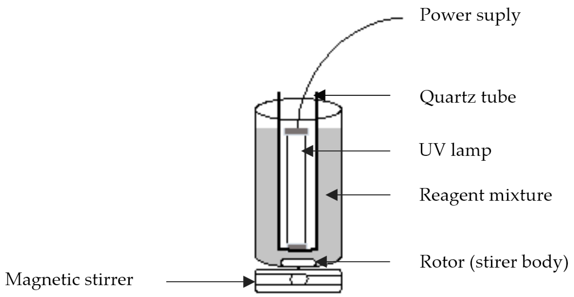 The 1 L bottle borosilicate glass photochemical reactor was magnetically stirred and was illuminated by a UV light lamp (type SYLVANIA, λmax = 350 nm, P = 11 W, made in UK). The lamp light located vertically in the center of the reactor was used as artificial light source (Figure 2). Before the reaction started, Tylosin solution (15 mg·L−1) was mixed to 1 L of Milli-Q water and was homogenized for 25 min in the dark, a control sample was collected for analysis without any pre-treatment. Incorporation of FeSO4∙7H2O to the antibiotic solution was performed under permanent magnetic stirring until complete dissolution. After that, the hydrogen peroxide solution was added; finally, H2SO4 (1 mol∙L−1) was used to adjust the pH. In the end of the treatment, sodium sulfite anhydrous (Na2SO3) was added to stop the Fenton reaction. The dosage of Fe(II), H2O2 (30% wt) and H2SO4 was determined by the factorial design for variable optimization. Tylosin mineralization was followed by TOC analyzer Analytic Jena multi N/C 3100 TOC/TNb with the detection limit of 4 µg∙L−1.