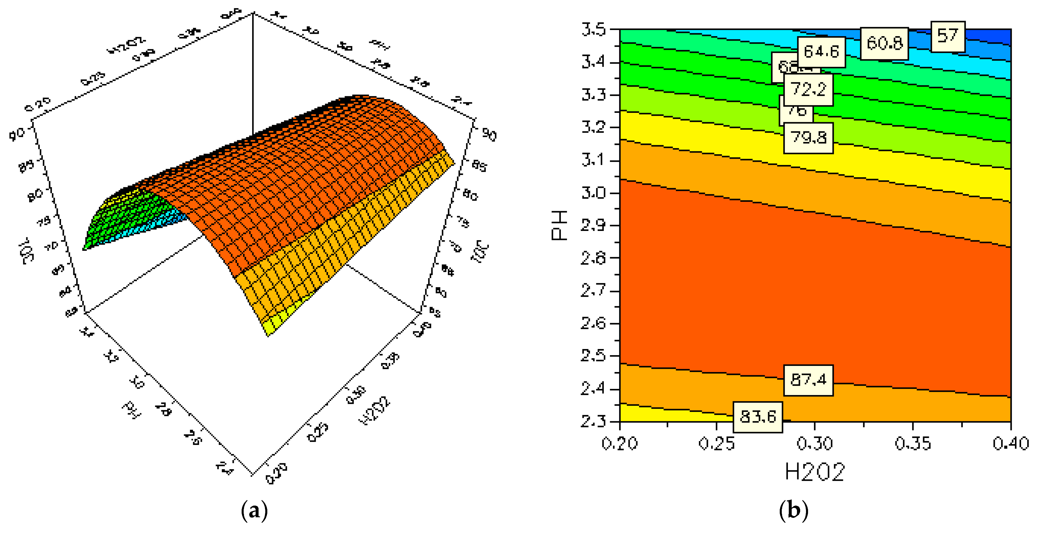 The significance of each model parameter was determined by means of Fischer’s F-value and p-value. The F-value is the test for comparing the curvature variance with residual variance and probability >F (p-value) is the probability of seeing the observed F-value if the null hypothesis is true. Small probability values call for rejection of the null hypothesis and the curvature is not significant. Therefore, the larger the value of F and the smaller the value of p, the more significant the corresponding coefficient is [32]. As shown in Table 3, we concluded that the independent variables of the quadratic model, including the pH value (X2), the ferrous ion concentration (X3) and the second-order effect of the pH value (X22), are highly significant parameters because p < 0.001. Moreover, the H2O2 value (X1), the interactions between the H2O2 concentration (X1) and pH value (X2), the interactions between the H2O2 concentration (X1) and ferrous ion concentration (X3) and the second-order effect of the ferrous ion value (X32) are significant because p < 0.05. The p value >0.05 means that the model terms are insignificant. We can see from Table 3 that interactions between the pH (X2) and ferrous ion concentration (X3), and the second-order H2O2 value (X12) are insignificant.