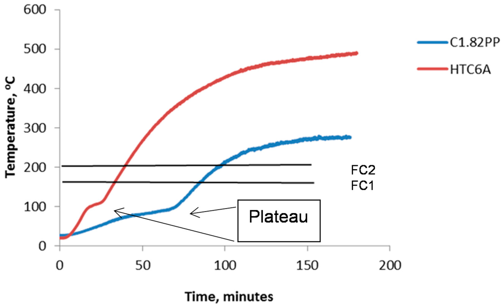 | Cold side temperature at 120 min, °C | 247 | 444 |