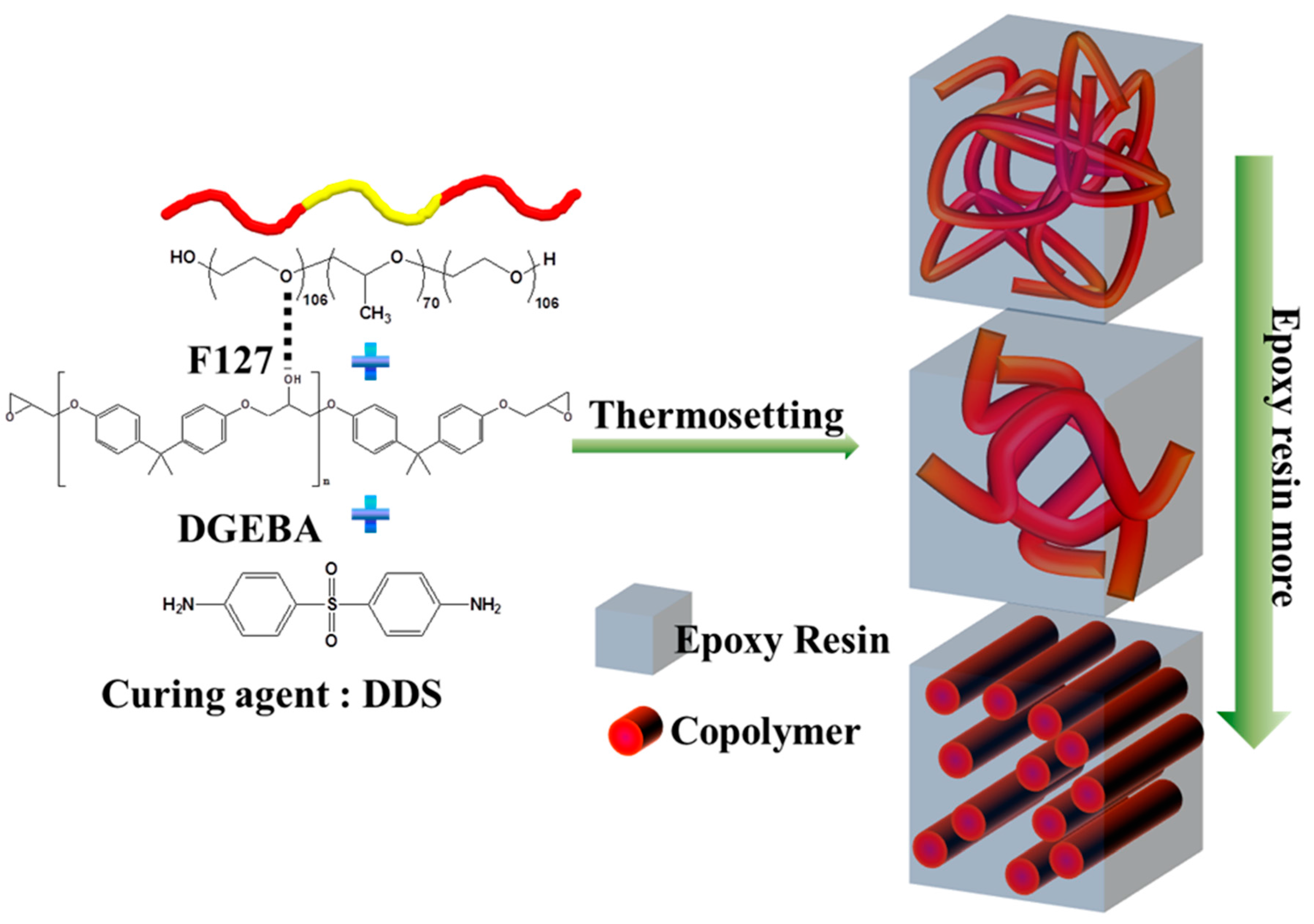 The DGEBA epoxy resin, DDS (curing agent), and pluronic F127 (flexibility agent) were dissolved in THF to form a homogenous solution. The solvent was evaporated slowly at room temperature, and then the samples were dried at 40 °C overnight under vacuum. The samples were subsequently cured using the following temperature profile: 100 °C for 3 h, 150 °C for 3 h, and 200 °C for 0.5 h (heating rate: 2 °C/min).