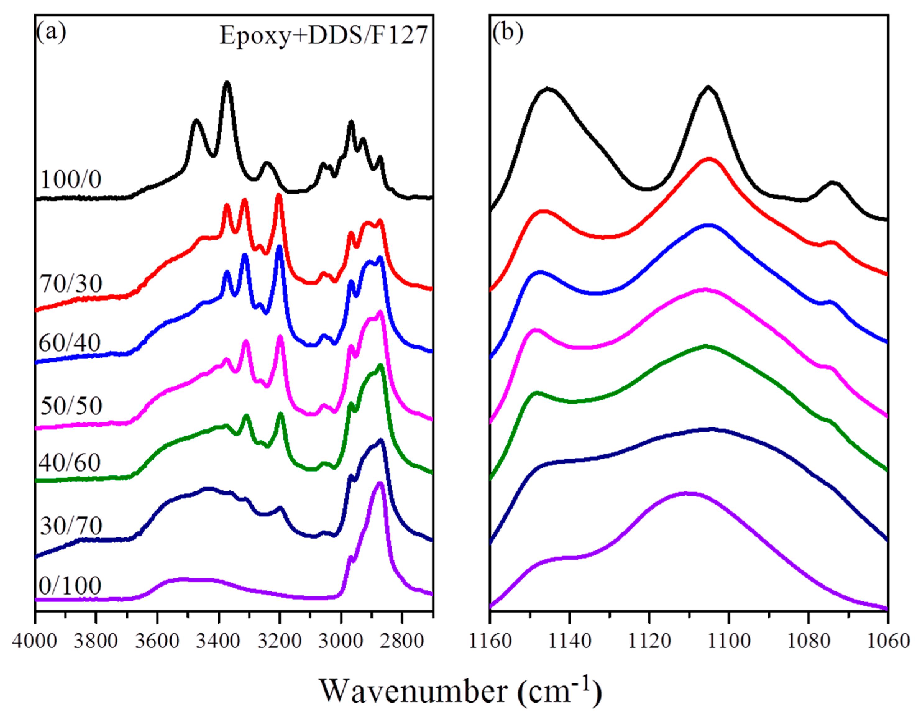 Room-temperature Fourier transform infrared (FTIR) spectra of epoxy/F127 blends, displaying the (a) OH stretching and (b) ether regions.
